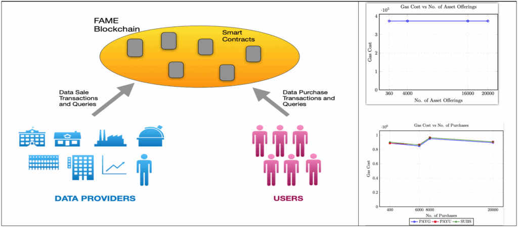 The FAME Federated Data Marketplace utilizes blockchain in order to immutably record data asset offerings by data providers and purchases by customers. FAME supports Pay-As-You-Go (PAYG), Pay-As-You-Use (PAYU) and Subscription (SUBS) models for data access purchases.